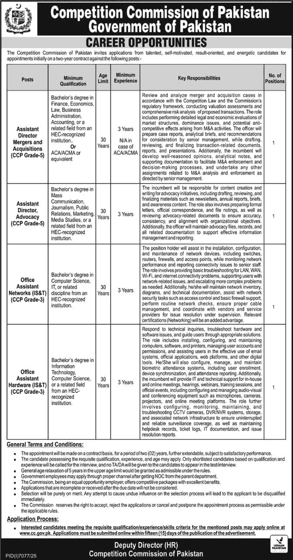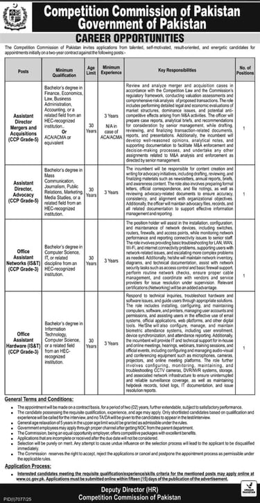 Competition Commission of Pakistan has announced multiple government job openings in 2025 for Assistant Directors and Office Assistants in IT and networking fields. Eligible candidates can apply online through CCP.