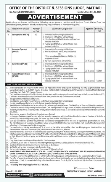 Apply for District & Sessions Court Matiari Jobs 2025 through NTS. Vacancies include Stenographer, Computer Operator, Junior Clerk, and Assistant Record Keeper (BPS-11 to BPS-16). Last date: 31 December 2025.