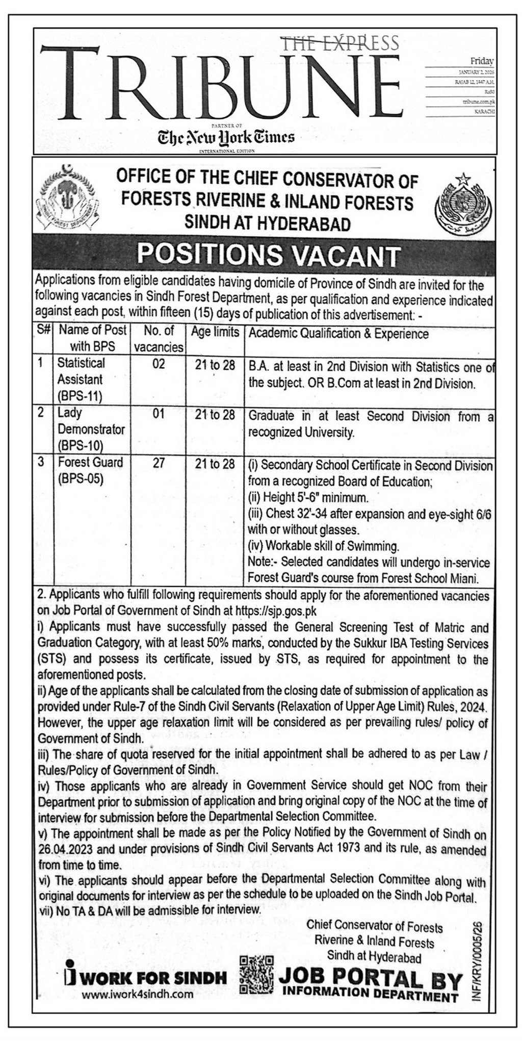 The Office of the Chief Conservator of Forests (Riverine & Inland Forests), Sindh at Hyderabad has announced multiple vacancies for eligible candidates having domicile of Province of Sindh. Applications are invited for government posts including Statistical Assistant (BPS-11), Lady Demonstrator (BPS-10), and Forest Guard (BPS-05). Candidates must meet the required education, age limit, and (for Forest Guard) physical standards. Applications must be submitted through the Sindh Job Portal (sij.gos.pk) within fifteen (15) days of publication of the advertisement.