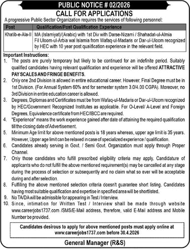 A progressive public sector organization in Pakistan has announced a job vacancy for the position of Khatib-e-Ala-II (Senior Khateeb) in 2026. Candidates with MA Islamiyat or MA Arabic (1st Division), Darse-Nizami / Shahadat-ul-Almia from Wafaq-ul-Madaris or HEC-recognized Dar-ul-Uloom, and 10 years of relevant post-qualification experience are eligible to apply. The post offers attractive pay scales and fringe benefits. Online applications must be submitted before 30 April 2026.
