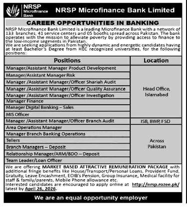 NRSF Microfinance Bank Limited, a leading microfinance bank in Pakistan with 133+ branches, is hiring qualified graduates for multiple roles including Manager Product Development, Risk, Shariah Audit, Finance, Digital Banking Sales, Branch Managers, Loan Officers, and Tellers. Positions available at Head Office Islamabad, Bahawalpur, Faisalabad, and across Pakistan. Candidates with at least a Bachelor’s degree from an HEC-recognized university can apply online before April 26, 2026. Attractive market-based salary plus house loan, transport loan, medical coverage, provident fund, gratuity, and more.