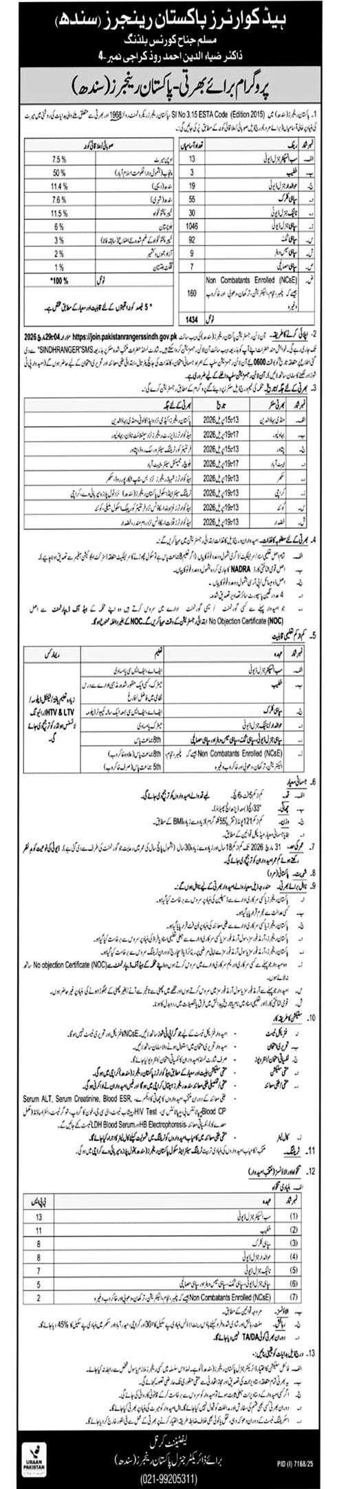 Pakistan Rangers (Sindh) has announced new government job opportunities for 2026 for various posts including Sepoy General Duty, Clerk, Medical Staff, and technical positions. Candidates from across Pakistan can apply online through the official recruitment portal before the closing date.