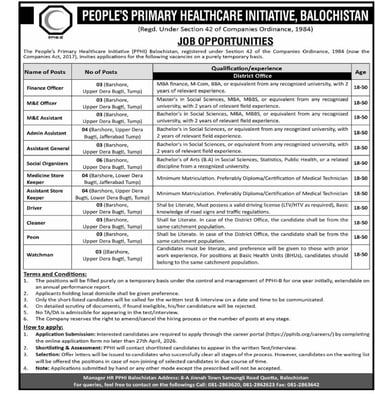 The People’s Primary Healthcare Initiative (PPHI) Balochistan, a registered organization under Section 42 of the Companies Ordinance (now the Companies Act 2017), has announced job openings for various positions across multiple districts. These vacancies are offered on a purely temporary basis for an initial period of one year, extendable based on annual performance.