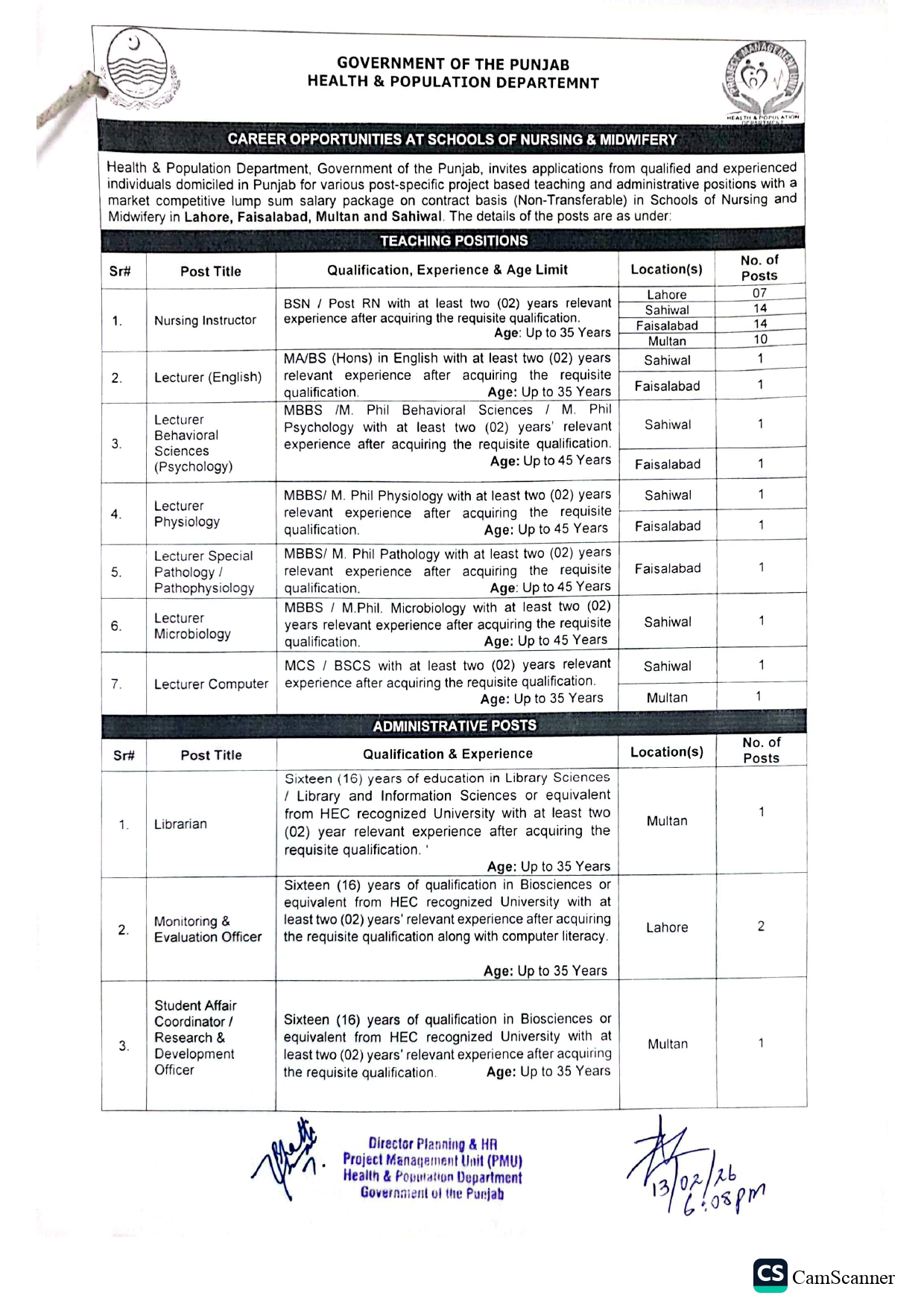 Punjab Health and Population Department is hiring teaching and administrative staff for Schools of Nursing & Midwifery. Apply through NTS before 04 March 2026.