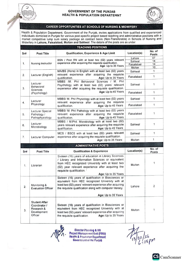 The Government of the Punjab, Health and Population Department, has announced career opportunities in Schools of Nursing and Midwifery across multiple cities of Punjab.
