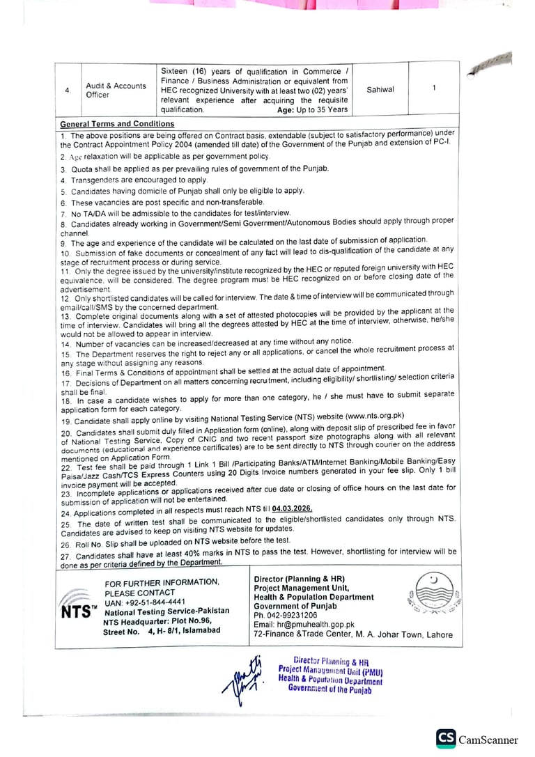 These vacancies are offered on a contract basis under the Project Management Unit (PMU). Qualified and experienced candidates domiciled in Punjab are encouraged to apply through the National Testing Service (NTS).