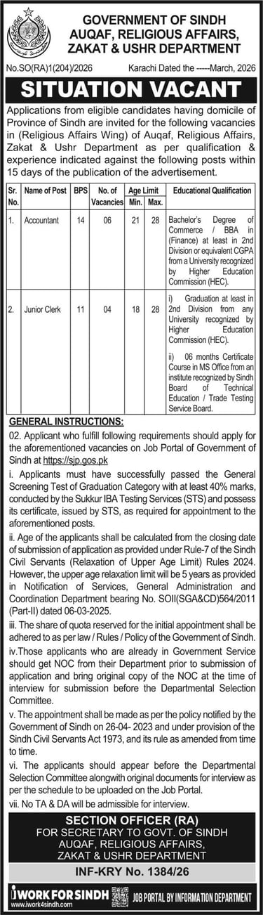 Keywords: Sindh Auqaf Department jobs 2026, Accountant jobs in Sindh government, Junior Clerk jobs 2026, STS test required jobs, Government of Sindh vacancies, Religious Affairs Wing recruitment, BPS-14 jobs, BPS-11 jobs, Sindh job portal apply online, fresh government jobs Sindh