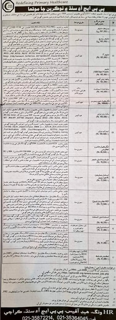 Sindh Health Department Jobs 2026, District Manager BS-17 BS-18, Manager Research Karachi, Manager IT Karachi, 1000 Days Project Manager, Public Health Specialist Sindh, Executive HR Karachi, Software Developer Karachi, Android Developer Karachi, Executive Finance Accounts Sindh, Pharmacist Store Manager Sindh, Nurse NICU Jobs, Blood Bank Technician Sindh, Assistant Registration, FC Coordinator, IYCF Counselor Female Sindh
