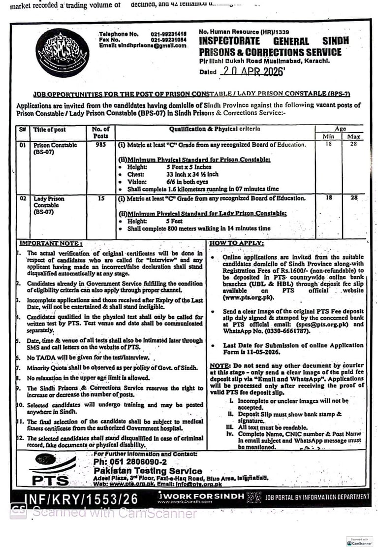 Pakistan Testing Service (PTS) invites online applications from Sindh domicile holders for 1000 vacancies of Prison Constable (BPS‑7) and Lady Prison Constable (BPS‑7) in Sindh Prisons & Corrections Service. Matric with C grade, physical fitness test, age 18–28 years. Last date to apply: 11‑05‑2026.