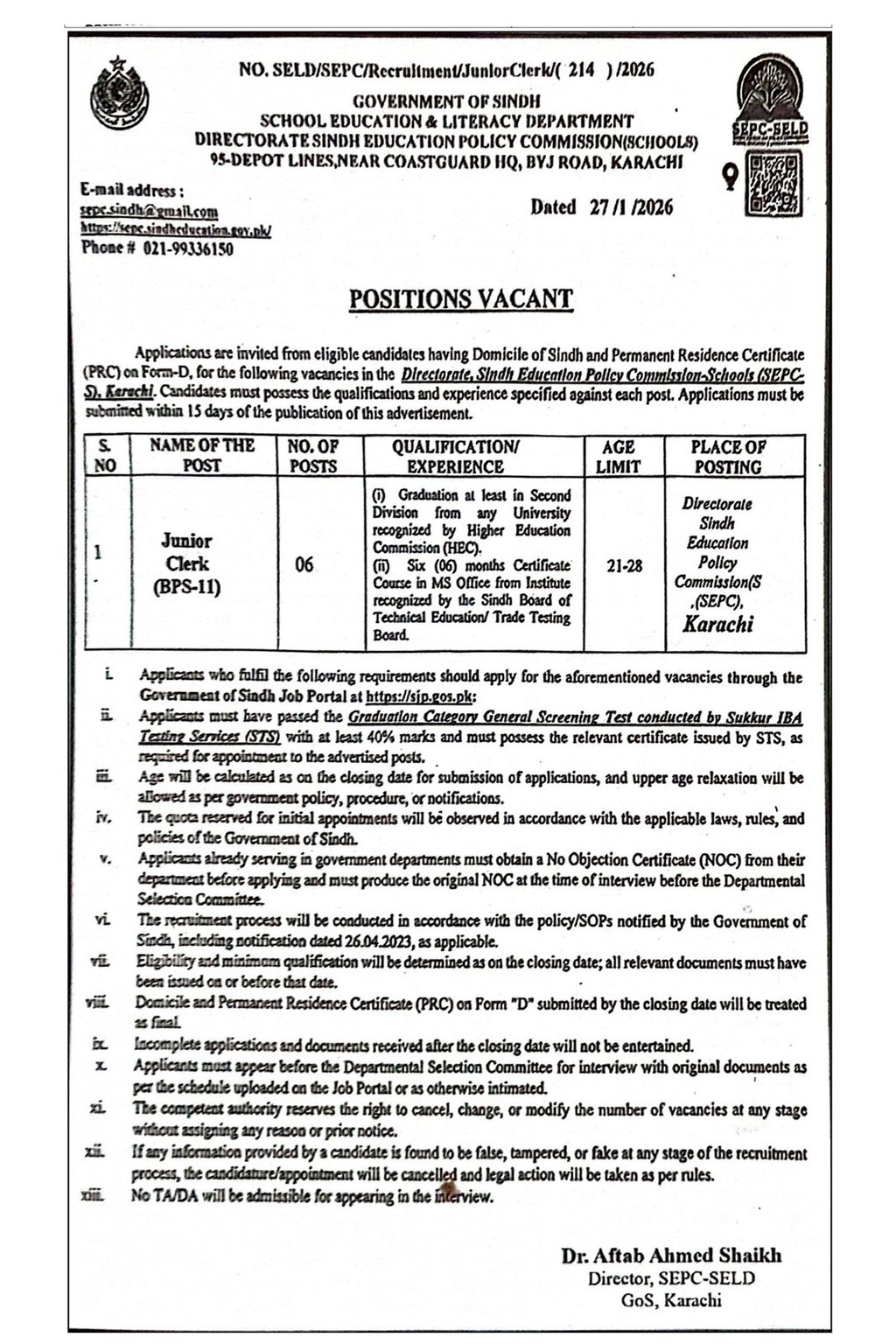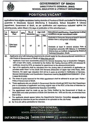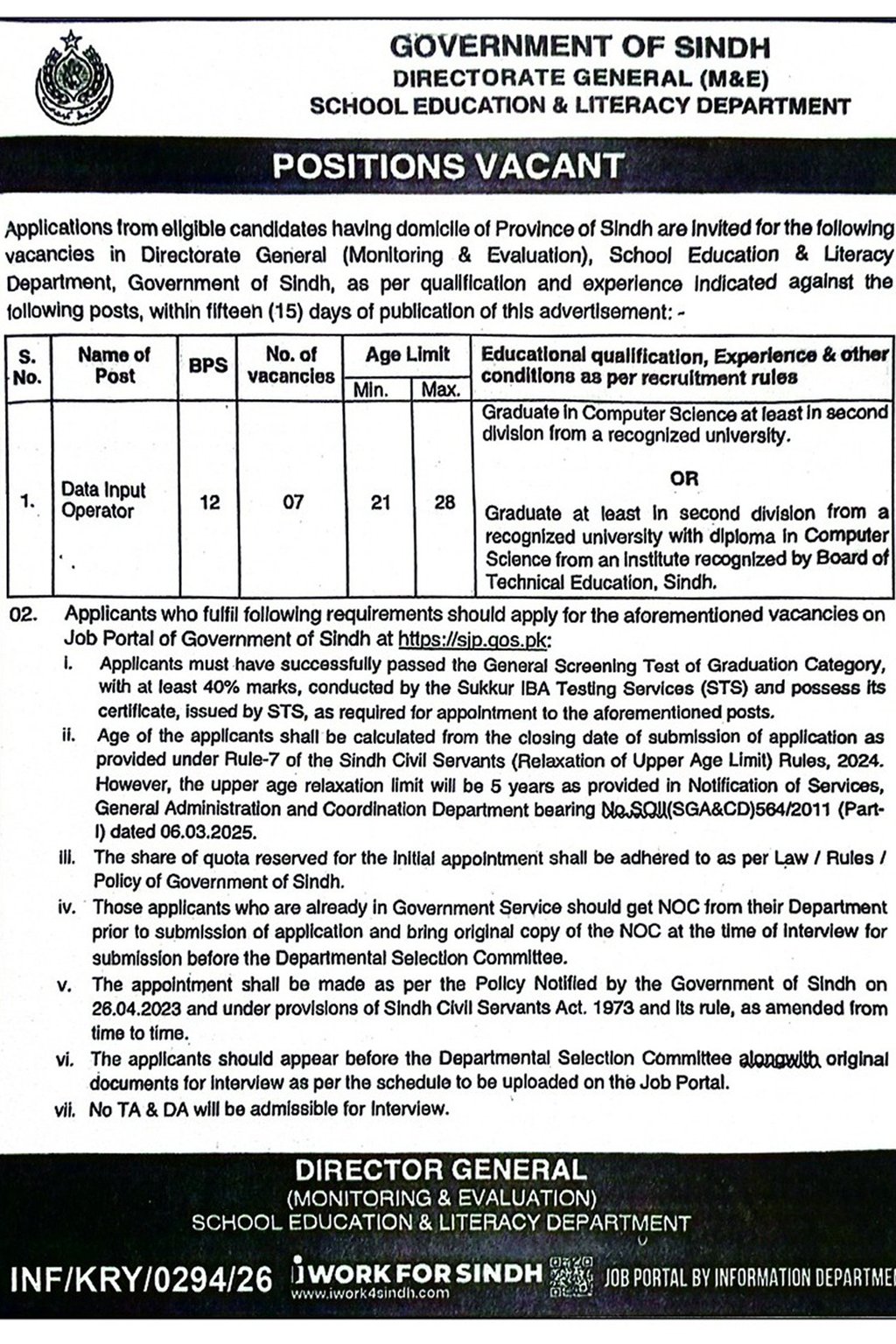 The Government of Sindh has announced new government jobs in the School Education & Literacy Department for eligible candidates holding Sindh domicile. Vacancies are available for Junior Clerk and Data Input Operator positions in Karachi.