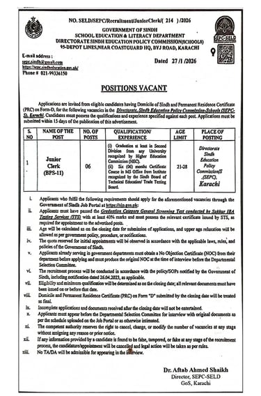 Government of Sindh announces Junior Clerk and Data Input Operator jobs 2026 in School Education & Literacy Department. Eligible candidates can apply online through the Sindh Job Portal.
