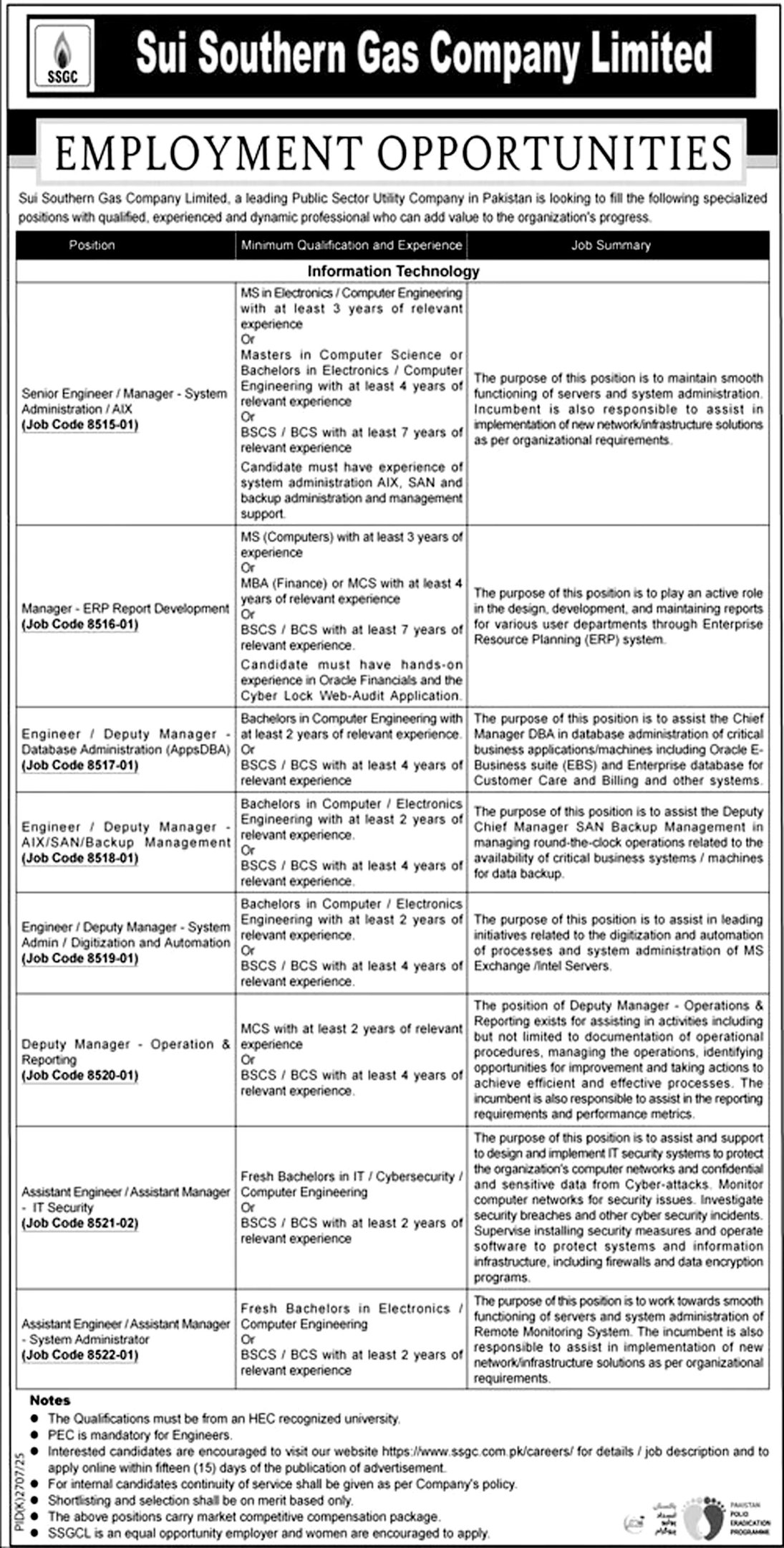 Sui Southern Gas Company Limited announces multiple IT and engineering vacancies in 2026. Apply online within 15 days for database, ERP, security, system administration, and management positions.