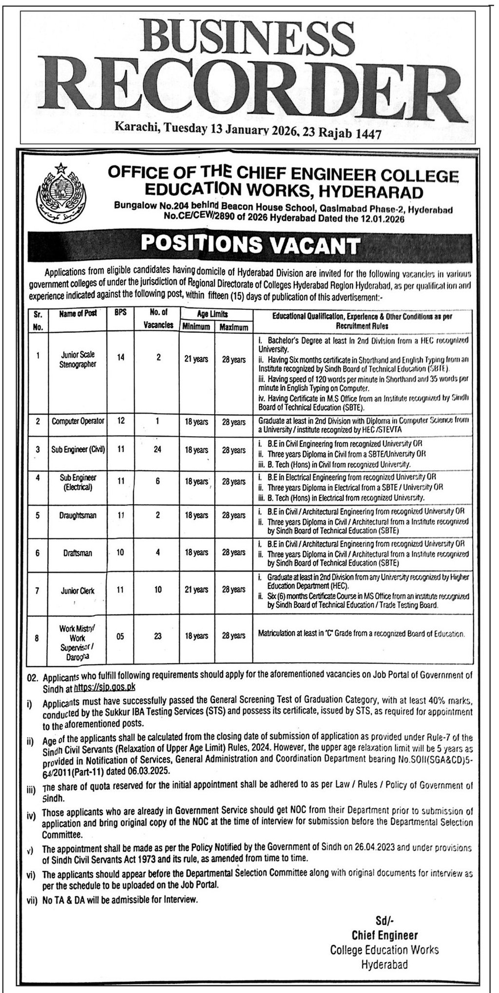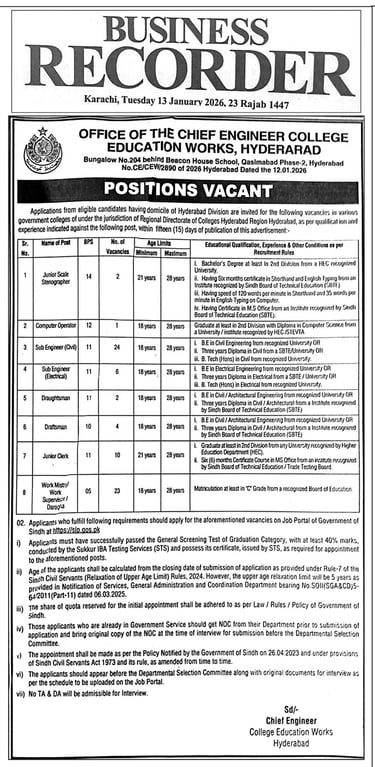 Chief Engineer College Education Works Hyderabad Jobs 2026, sij.gos.pk jobs, Sub Engineer Civil jobs Sindh, Sub Engineer Electrical Hyderabad, Junior Clerk Hyderabad jobs, Stenographer BPS-14 Sindh, Government Jobs Hyderabad Division