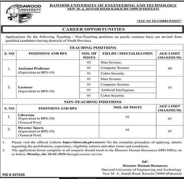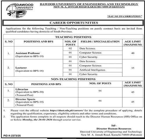 Apply for Dawood University of Engineering & Technology (DUET) Jobs 2026 in Karachi. Teaching and non-teaching vacancies including Assistant Professor, Lecturer, Librarian, and Director Sports. Sindh domicile required. Last date to apply is 26 January 2026.