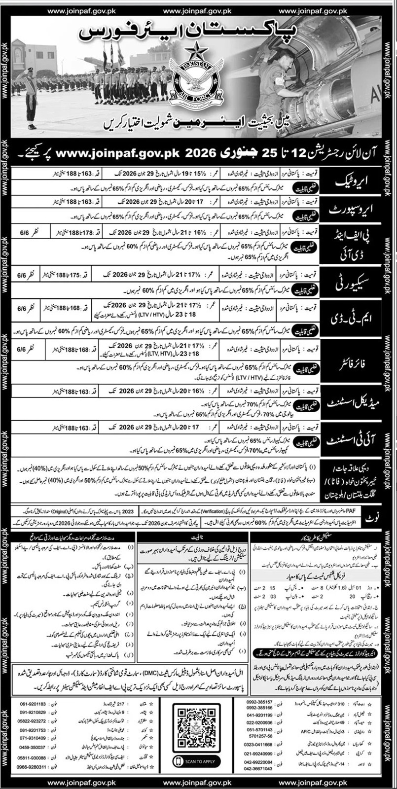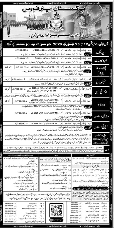 Pakistan Air Force announced Airmen jobs 2026. Apply online from 12 to 25 January 2026 at joinpaf.gov.pk. Trades include Aerotech, Aero Support, ADI Tech, Security, MTD, Fire Fighter, Medical Assistant, and IT Assistant. Focus Keywords: PAF Jobs 2026, joinpaf gov pk, Pakistan Air Force Airmen Jobs, PAF online registration 2026, Aerotech jobs, PAF Security jobs, MTD PAF, Medical Assistant PAF, IT Assistant PAF