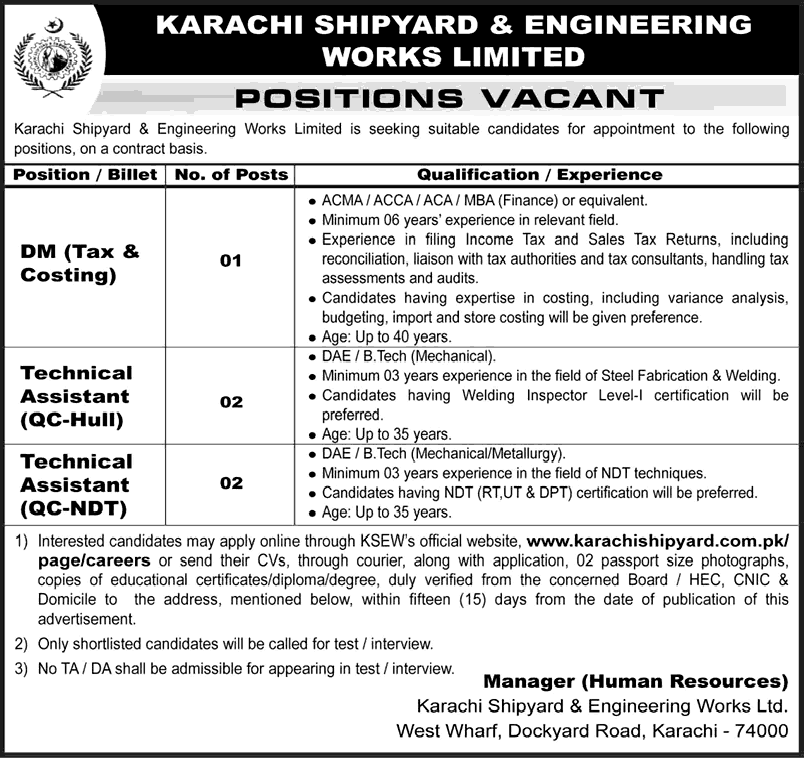 Karachi Shipyard & Engineering Works Limited (KSEW) announced contract jobs in Karachi for DM (Tax & Costing) and Technical Assistants (QC-Hull/QC-NDT). Apply within 15 days.