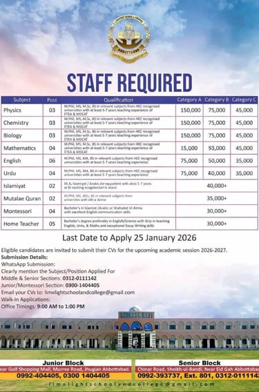 Limelight School & College Abbottabad has announced new teaching vacancies for the upcoming academic session 2026–2027. Interested candidates can apply for multiple subjects (Junior, Montessori, Middle & Senior). The last date to apply is 25 January 2026.