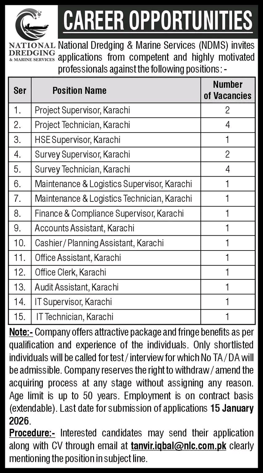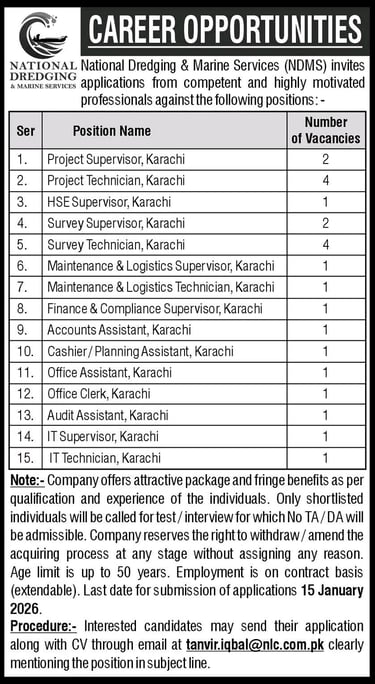 NATIONAL. National Dredging & Marine Services (NDMS) invites DREDGING applications from competent and highly motivated professionals against the following positions: