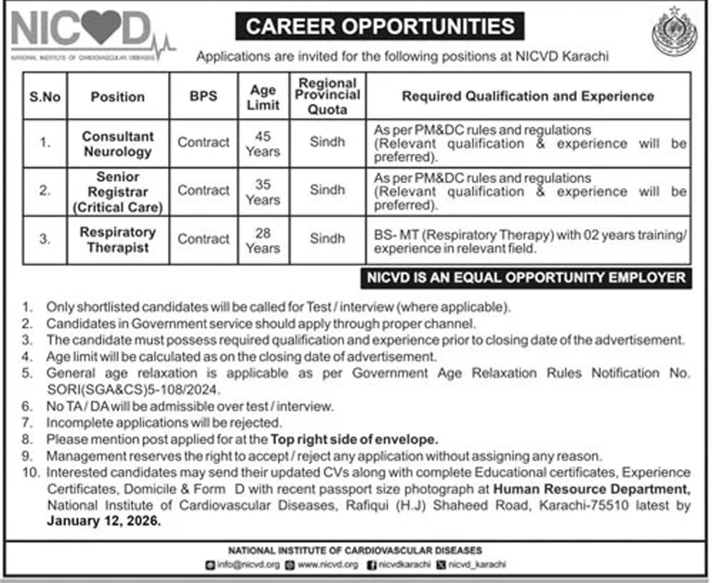 CAREER OPPORTUNITIES National Institute of Cardiovascular Diseases NICVD Karachi Jobs 2026 Public sector jobs