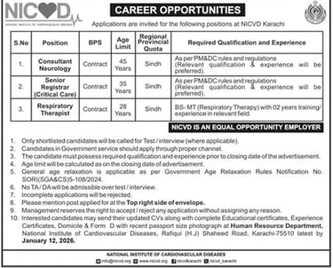 The NICVD Karachi Jobs 2026 have been officially announced by the National Institute of Cardiovascular Diseases (NICVD), Karachi, offering outstanding career opportunities for medical and allied health professionals. These latest government medical jobs in Sindh 2026 are available on a contract basis and are ideal for candidates seeking high-profile healthcare jobs in Karachi.