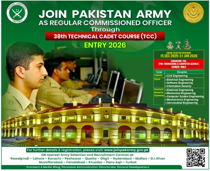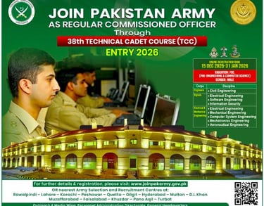 Apply for Pakistan Army 38th Technical Cadet Course (TCC) Entry 2026. Online registration: 15 Dec 2025 to 31 Jan 2026. For Male candidates with FSc (Pre-Engineering/Computer Science). Corps, disciplines, how to apply & FAQs.