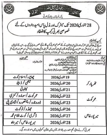 Pakistan Army special recruitment camp 2026 for candidates of District Tharparkar and Mirpurkhas Division. Check eligibility (Middle/Matric, age, height), documents, and camp schedule (19–28 Jan 2026). This is not an online job.