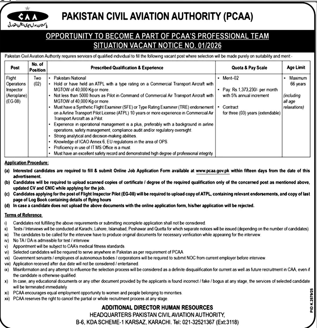 Pakistan Civil Aviation Authority (PCAA) has announced a new career opportunity for highly qualified aviation professionals under its Situation Vacant Notice No. 01/2026.