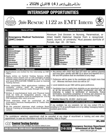 Rescue 1122 (Emergency Services Department, Government of Punjab) has announced EMT Internship 2026 through Central Testing Service (CTS). Candidates with a Nursing / Paramedical / Allied Health diploma or degree (minimum 2nd division) and Punjab domicile can apply for these internship positions. The age limit is 18 to 30 years and selected candidates will receive a monthly stipend of Rs. 40,000.