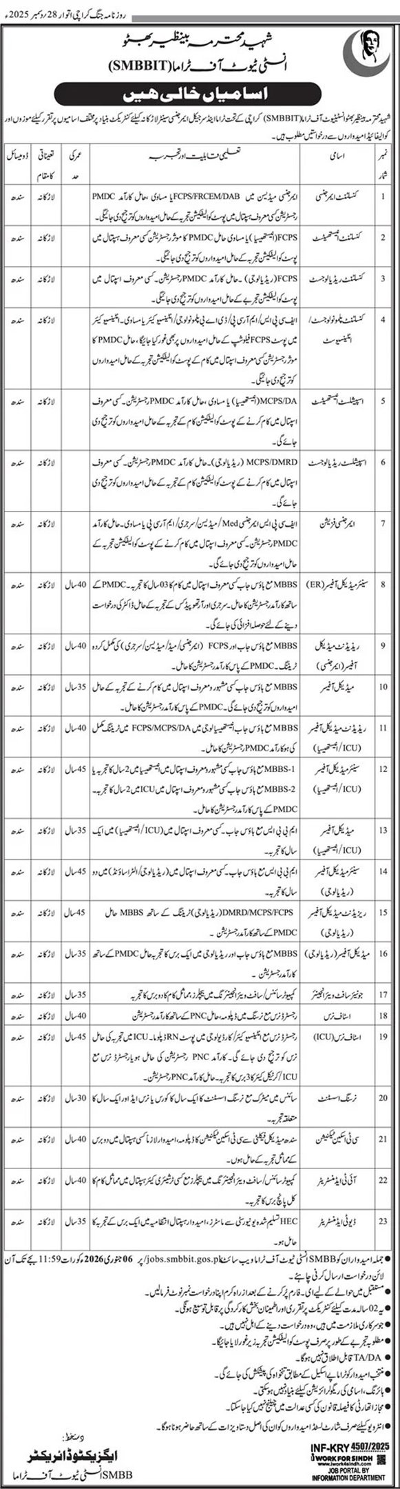 Shaheed Mohtarma Benazir Bhutto Institute of Trauma SMBBIT Larkana Latest Jobs 2026