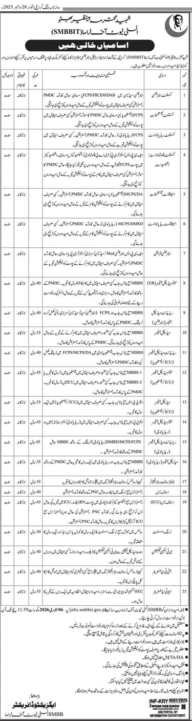 Shaheed Mohtarma Benazir Bhutto Institute of Trauma SMBBIT Larkana Jobs 2026
